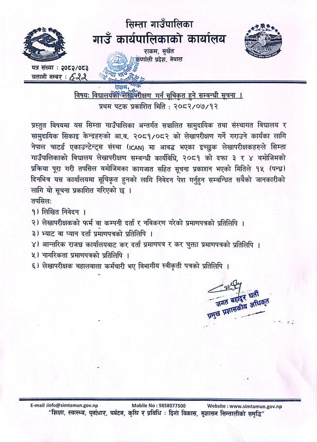 बिद्यालयको लेखापरीक्षण गर्न सूचिकृत हुने सम्बन्धी सुचना ।