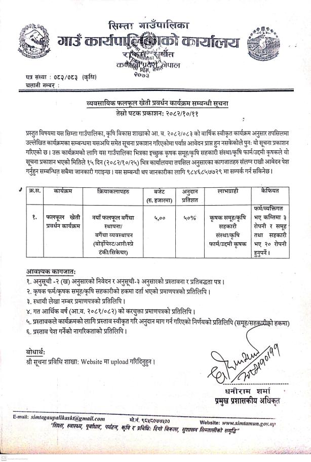 व्यवसायिक फलफुल खेती प्रवर्धन कार्यक्रम सम्बन्धी सुचना ।
