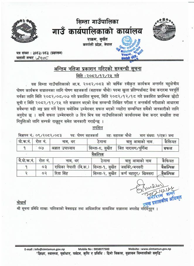 अन्तिम नतिजा प्रकाशन गरिएको सम्बन्धी सूचना ।