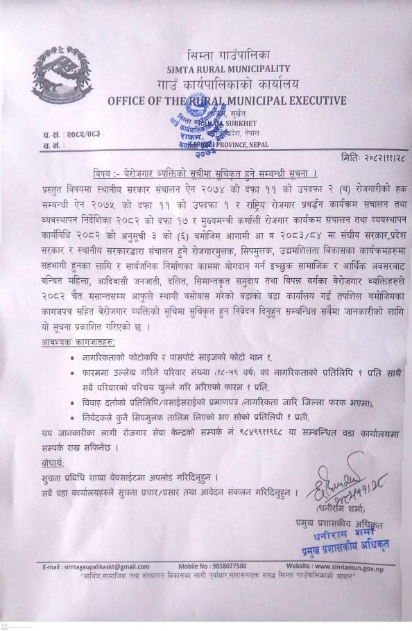 बेरोजगार व्यक्तिको सुचिमा सुचिकृत हुने सम्बन्धि सुचना!