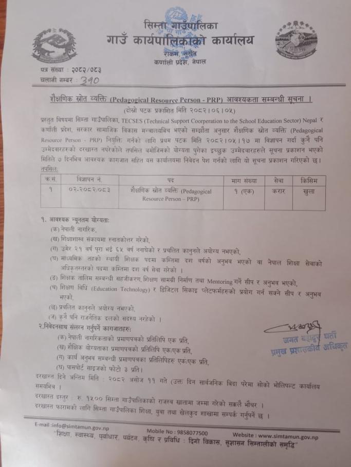 शैक्षणिक स्रोतव्यक्ती( Pedagogical Resource Person- PRP) आवश्यकता सम्बन्धि सूचना !